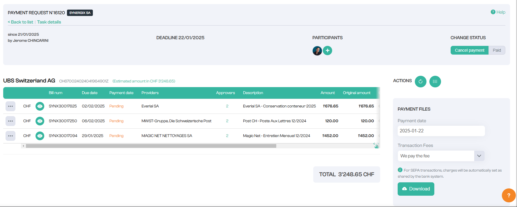 By pressing the action button next to each payment request, you can access the details of the request
